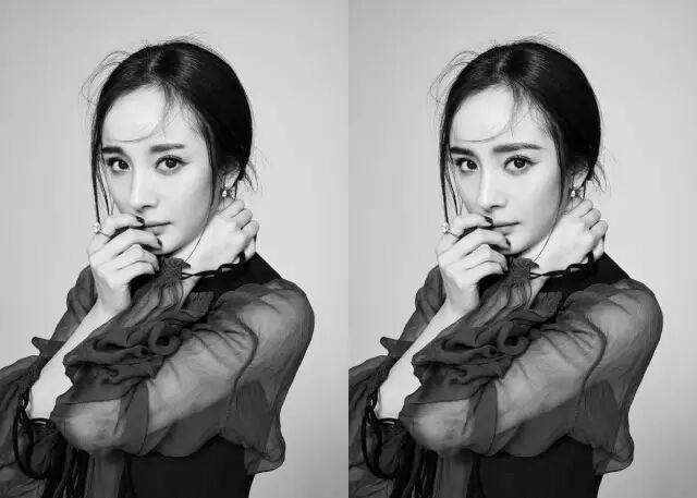 舉個範爺栗子,左圖用頭髮進行了遮擋,但是還是沒有有臉看起來顯瘦!右圖中有個小心機的細節,尾巴收尾很清晰,讓顴骨眼角等處顯得更加圓潤平滑,也拉長了整個視覺。不信可以擋住她鼻子嘴巴,是不是右圖瘦!